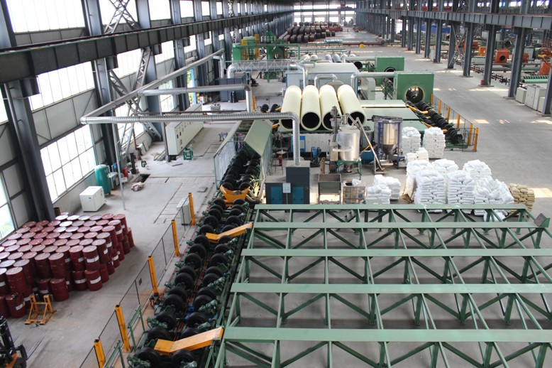 山東勝利泡沫噴涂保溫生產(chǎn)線可滿足管徑DN500—DN1600、保溫層厚度30—120mm、PE層厚度4.5—15mm的保溫管生產(chǎn),年生產(chǎn)能力達(dá)到110km。該生產(chǎn)線采用先進(jìn)的雙槍式連續(xù)聚氨酯噴涂系統(tǒng),噴涂機(jī)采用美國(guó)固瑞克 GRACO H-40型,可連續(xù)噴涂8-12小時(shí)而不需要清理噴槍。聚乙烯連續(xù)纏繞擠出機(jī)采用克勞斯瑪菲公司產(chǎn)品。生產(chǎn)線采用“噴涂纏繞法” 成型工藝,具有整體性能好、鋼管保溫粘接力優(yōu)、抗壓能力強(qiáng)、保溫層厚度噴涂靈活、外護(hù)層厚度薄等優(yōu)點(diǎn)。經(jīng)拋丸處理后的鋼管旋轉(zhuǎn)通過(guò)泡沫噴涂區(qū),噴涂機(jī)將一定壓力的異氰酸酯(黑料)和組合聚醚(白料)原料壓入噴槍的混合室內(nèi),進(jìn)行高速混合;噴槍將混合均勻的聚氨酯原料以傘形、霧狀形態(tài),均勻噴涂在螺旋前進(jìn)的鋼管上。聚氨酯原料在一定時(shí)間內(nèi)自由發(fā)泡,從而形成泡孔細(xì)密而密度均勻的聚氨酯泡沫;聚氨酯泡沫逐層噴涂至鋼管表面后,聚氨酯涂層逐層沉淀、熟化和固化,達(dá)到一定抗壓強(qiáng)度和厚度,當(dāng)聚氨酯表面硬化達(dá)到一定的抗壓強(qiáng)度后就可以上纏繞傳輸線進(jìn)行聚乙烯纏繞,擠出機(jī)擠出聚乙烯膜進(jìn)行多層纏繞,經(jīng)水冷卻后成型,完成保溫作業(yè)。